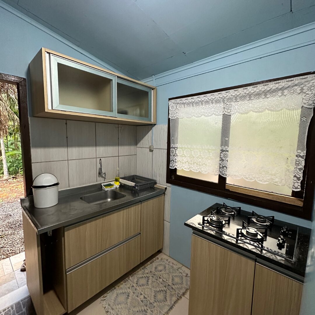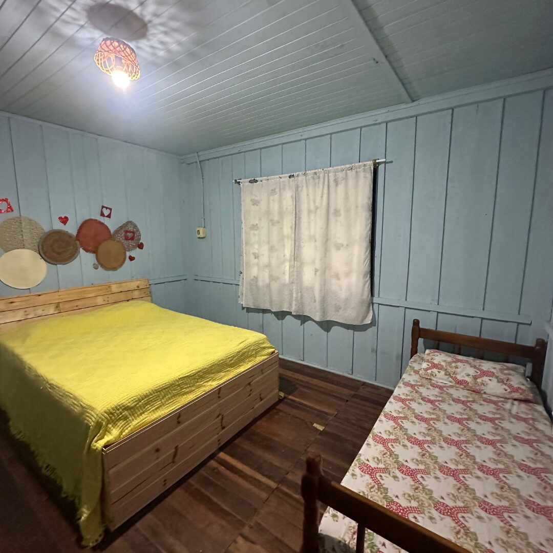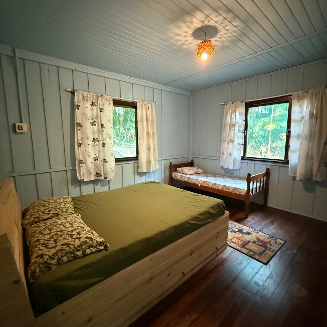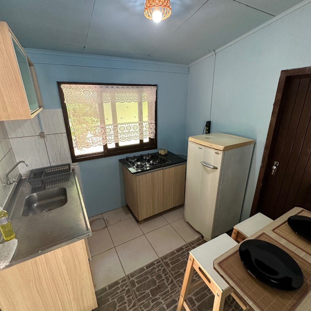 Essa hospedagem conta com cama de casal, cama de solteiro, área coberta, 4 cadeiras e mesa externa, mesa para refeições rápidas e 2 banquetas interna, fogão a gás, geladeira, utensílios de cozinha, banheiro com sanitário e chuveiro, área de fogueira e estacionamento.